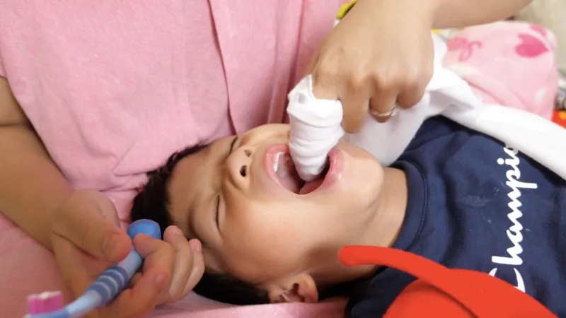 บอกให้ลูกอ้าปากกว้างๆ ทำการใช้ผ้าอ้อมสะอาดที่พันนิ้วเราเช็ดที่ฟันให้ทั่วก่อน แล้วบรรจงแปรงฟันทีละนิดเบา ๆ ให้ครบทุกซี่ หากฟองเยอะไปสามารถใช้ผ้าอ้อมที่พันนิ้วอยู่เช็ดออกได้ แต่ถ้าลูกร้องไห้ก็ต้องแข็งใจต่อ แปรงฟันให้เสร็จ